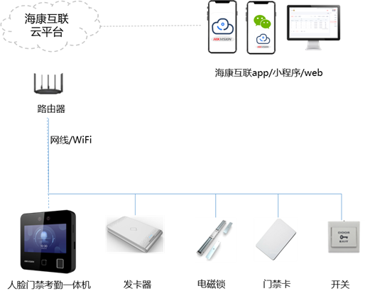 海康威视刷脸门禁考勤一体机,同时支持门禁和考勤功能,支持刷脸、指纹、刷卡多种方式通行或打卡,支持4G/WiFi/网线多种方式联网,刷脸门禁考勤一体机直连海康互联云平台,云平台负责数据的实时接收和下发,统一管理假勤、排班、权限等数据且将相关联的所有设备统一管理。
