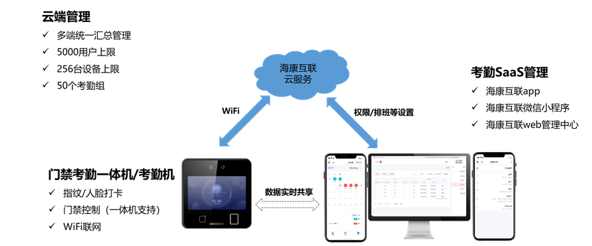 针对市场和用户需求,海康威视采用海康威视智能考勤机+海康互联云平台的软硬一体的解决方案,实现考勤审批管理。