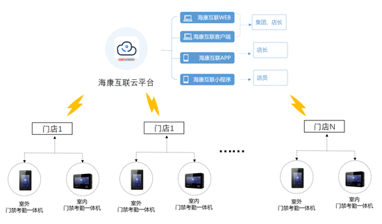 针对连锁门店分布散、组网困难的特点,海康互联采用云平台技术,门店门禁考勤设备联网后,通过海康互联云平台统一管理,实现连锁门店门禁、考勤统一管理需求。