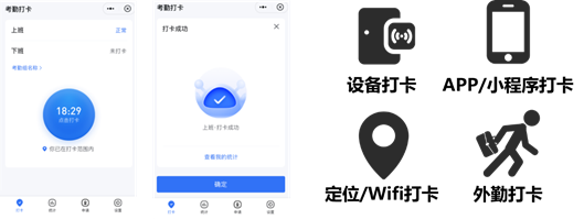 支持设备打卡、手机打卡的打卡方式,企业可根据自身需求进行选择,员工既可以在设备上打卡,也可以通过手机APP、小程序进行打卡,外勤时也可根据要求进行外勤打卡,员工通过APP即可查看打卡结果,第一时间知晓异常打卡情况……