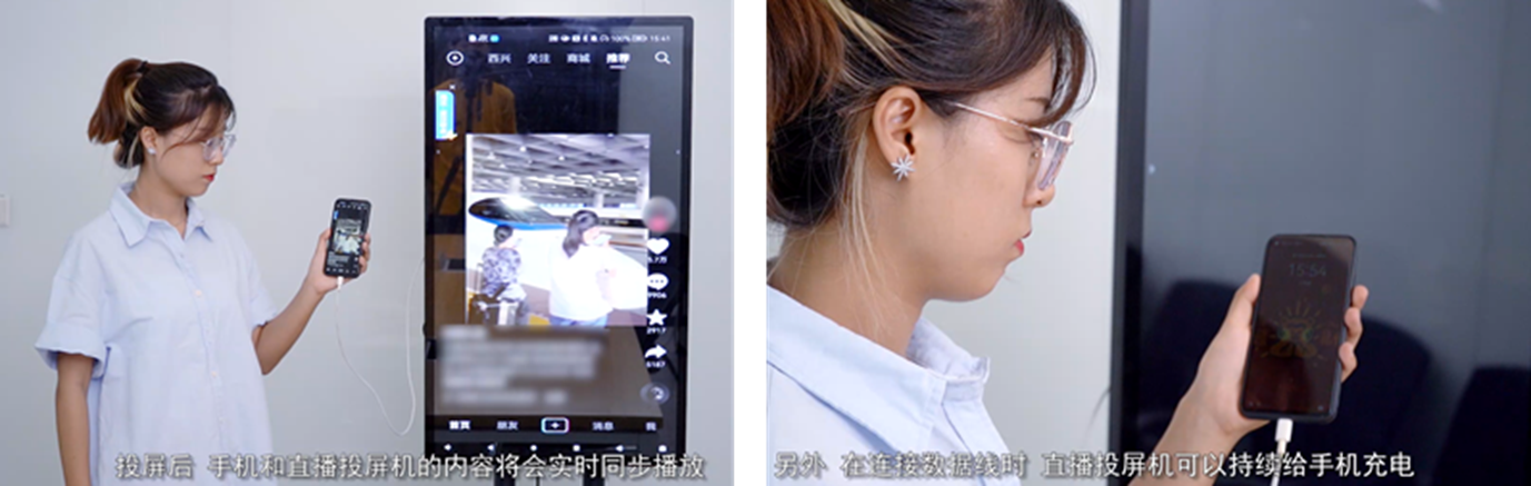 有线投屏,操作简单:手机数据线直连,自动提示下载投屏软件,手机内容实施呈现大屏,音频直接通过大屏播放、音量调节。大屏展示的同时,还可以给手机充电,直播过程中,不必担心手机电量不足。